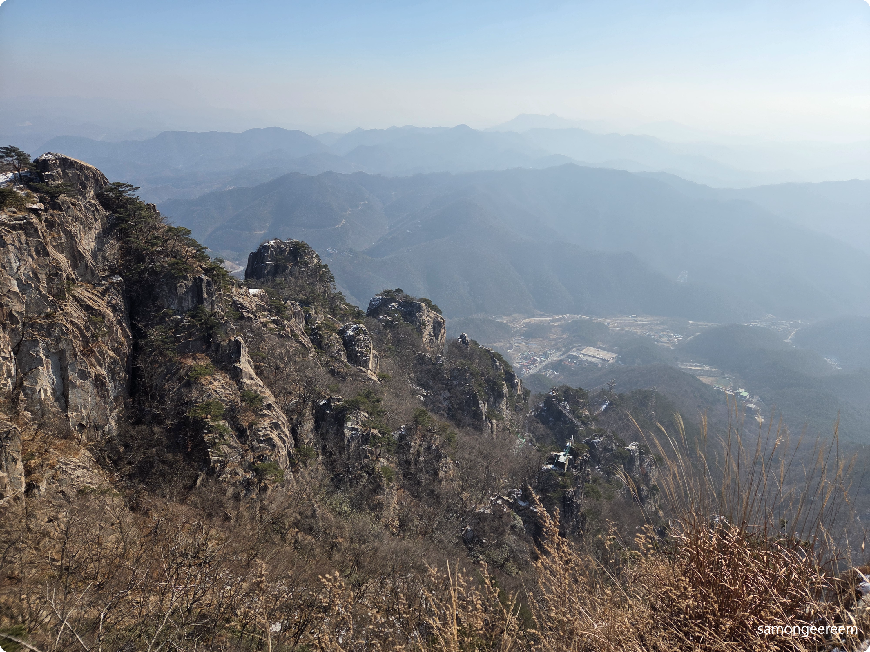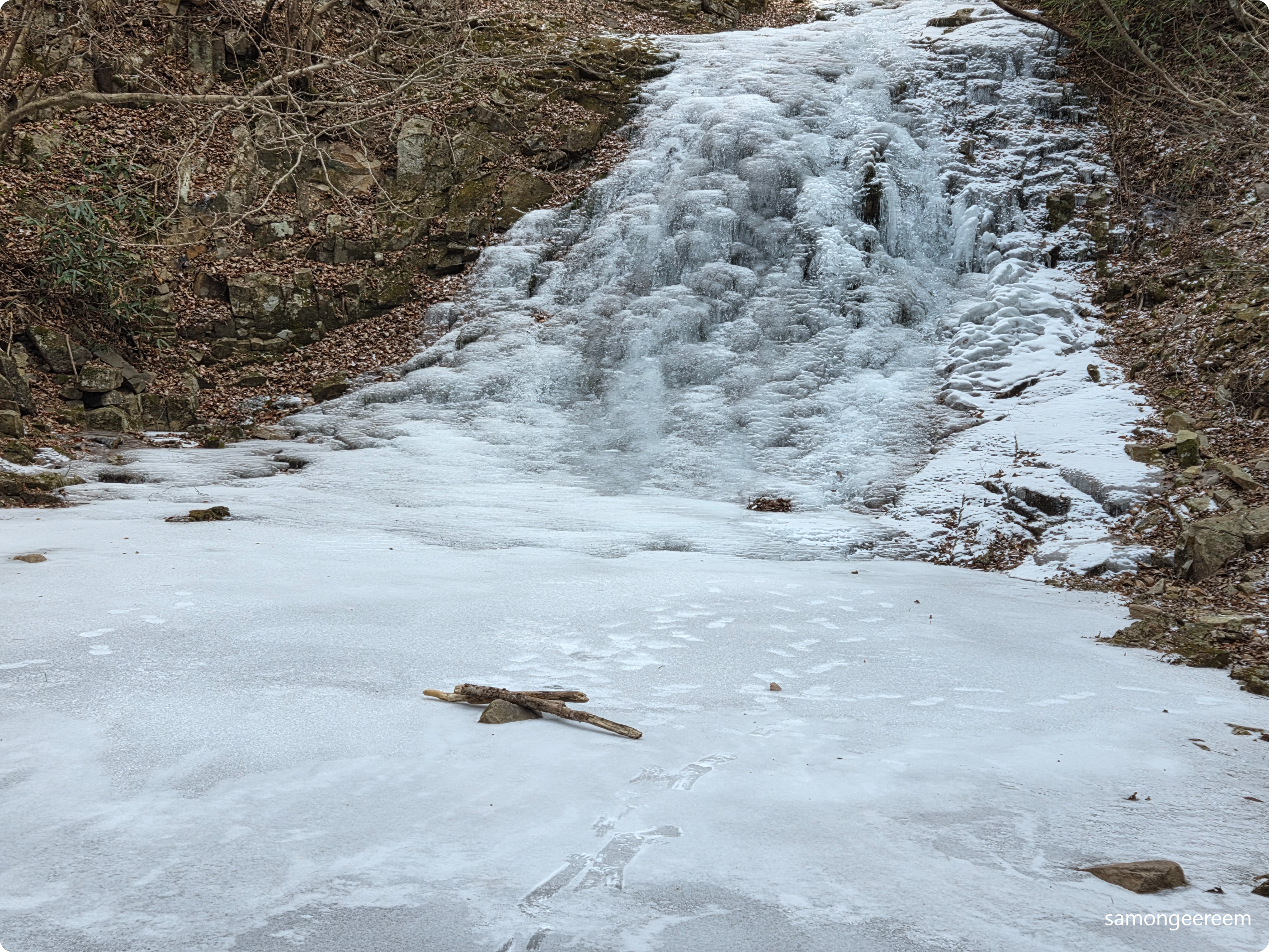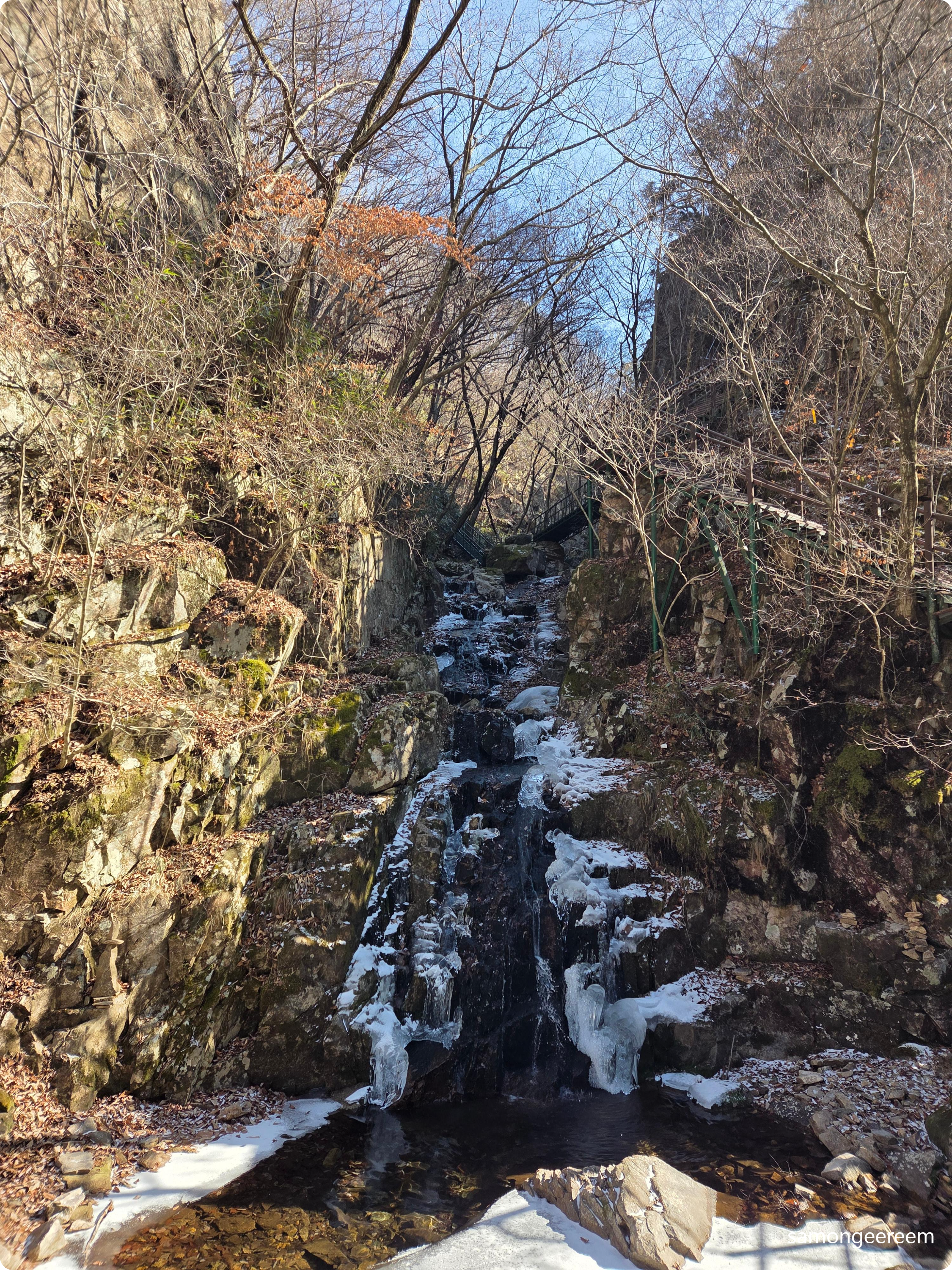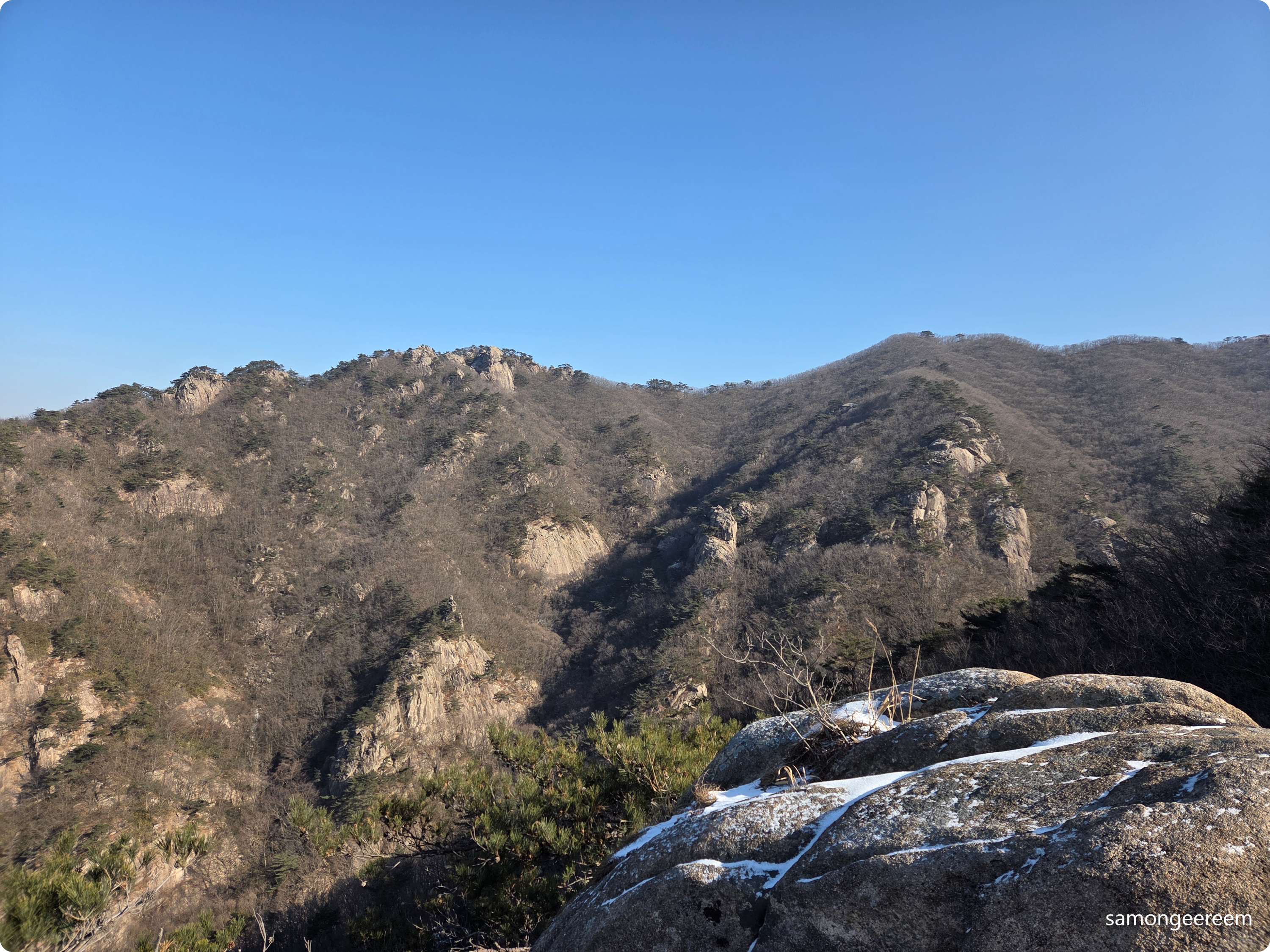 등로에 나서면 산은 늘 그 자리에 그러하다. 그러하다는 것은 경외감의 다른 표현이기도 하다. 그럼에도 불구하고 그러한 산이 오늘은 유독 낯설게 느껴진다. 늘 그 자리에 그러한 산이 낯설게 다가오는 것은 무슨 까닭일까? 계곡을 지나는 데크길은 간밤에 내린 눈서리가 아침 햇살을 받아 수줍은 듯 몸을 사리고 있고, 마른 계곡에는 물 듣는 소리가 그쳤다. 더불어 새들마저 조용하다. 적막을 깨는 것은 오로지 등로의 서릿발을 밟는 서걱 서걱 발자국 소리 뿐!